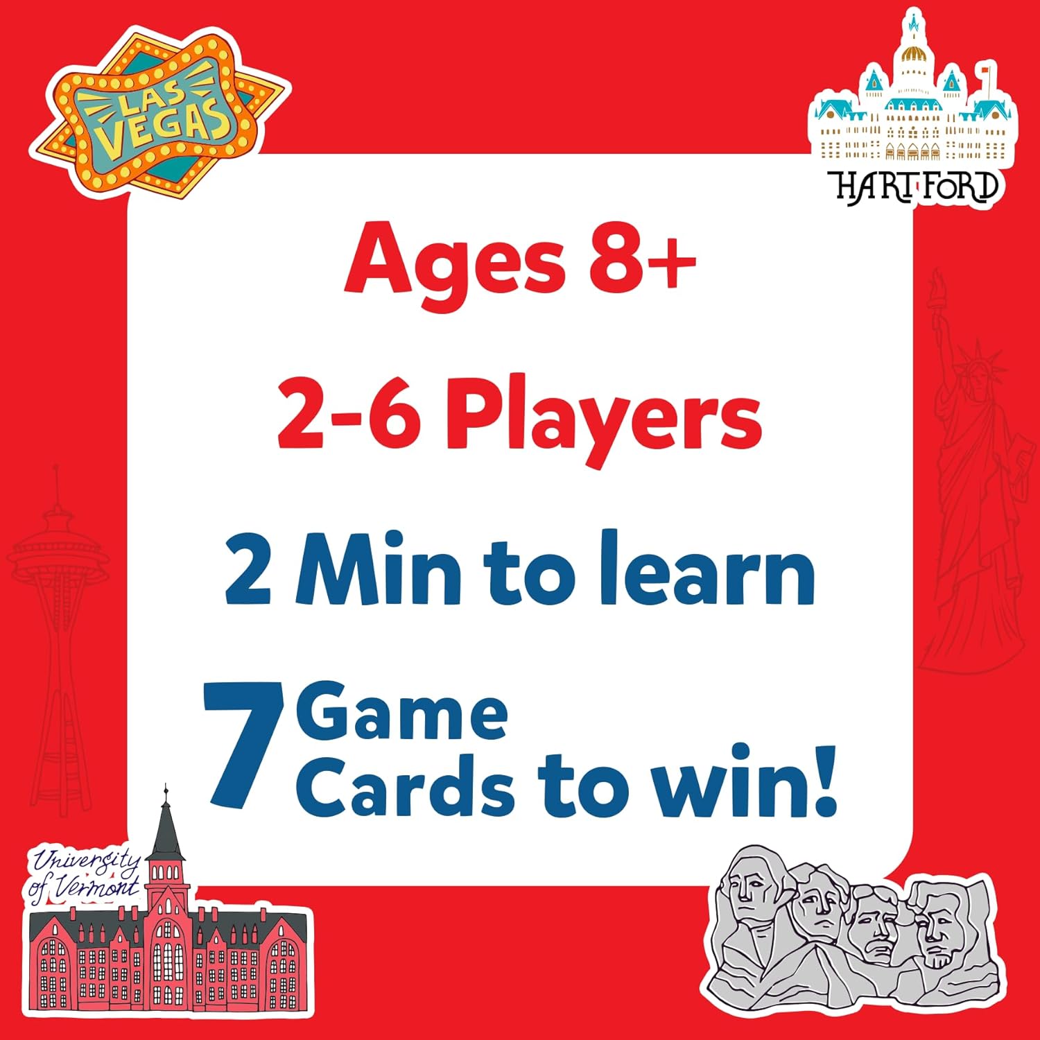 - ULTIMATE GUESSING GAME: Divide yourselves up in teams, or play one on one, and ask up to 10 questions to guess the state on the Game Card! Does this state have a lot of beaches? Are the Red Sox from this state? Does this state have a large coast? Think hard, ask intelligent questions and be the first player to win 7 game cards!