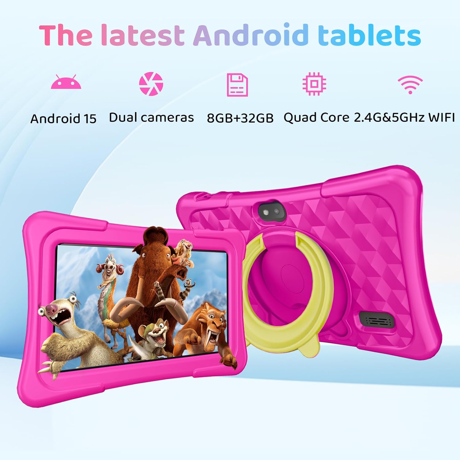 Kids Tablet, 7 inch Android 15 Tablet for Kids, 8GB+32GB 1TB Expand, Quad-Core Toddler Tablets with Shockproof Case, BT5.0, WiFi 5, Parental Control, Games, Dual Camera (Rose)