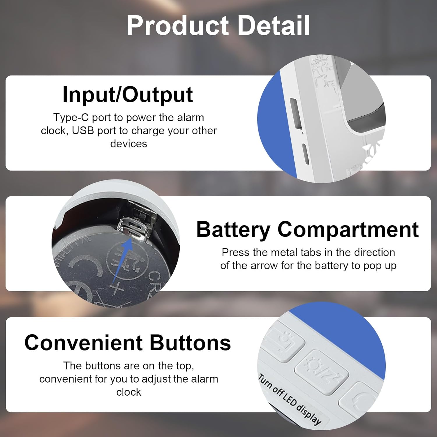 - Dual USB Port: This alarm clock for bedroom has 2 USB ports, so you can charge your cell phone or headphones while using the alarm clock. With a memory battery included, you don't have to worry about having to reset the time even if the external power supply goes down
