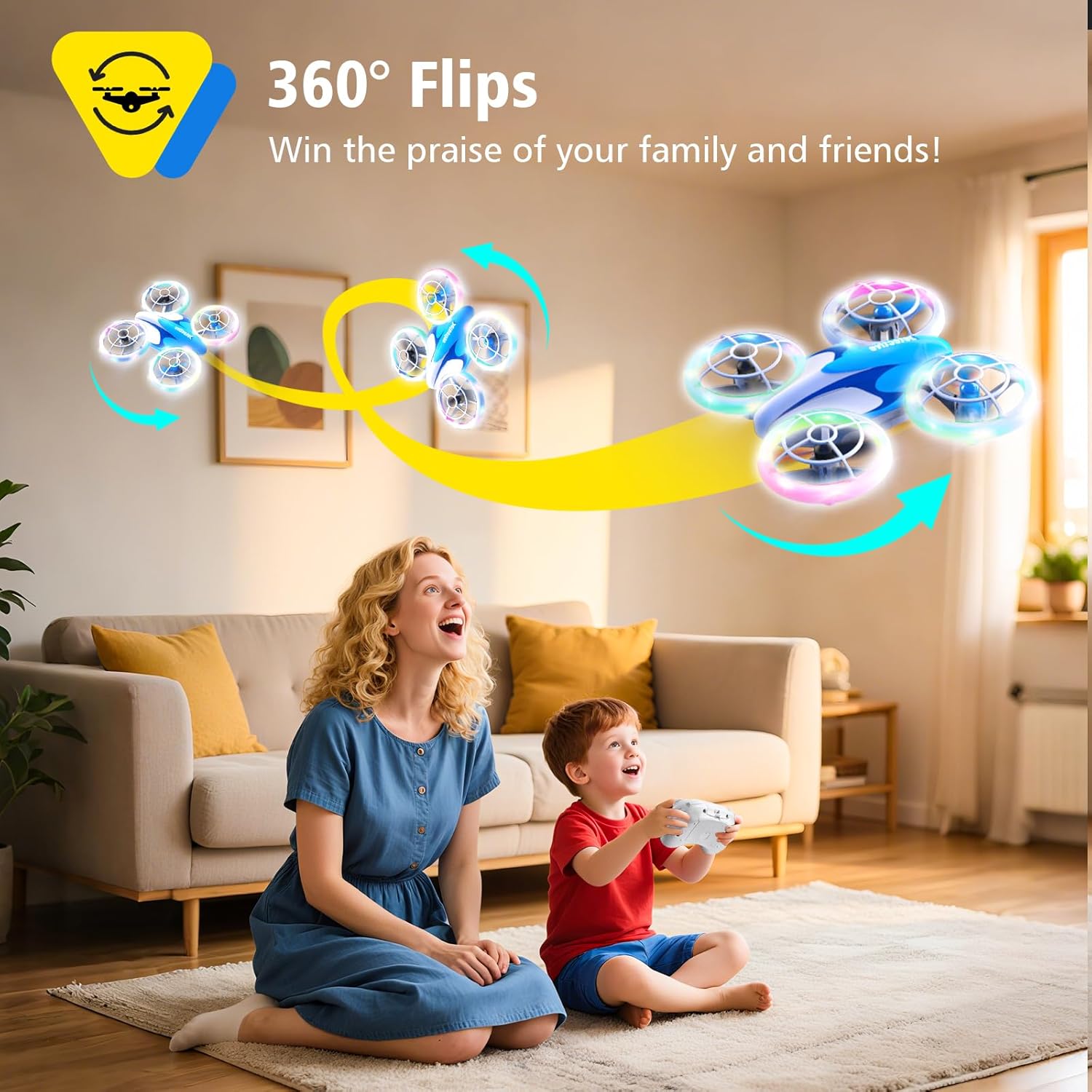 - ăColourful lightsăThis children's mini drone has 6 different lighting effects. Users can select the desired colorful lighting effects through the remote control. When starting or shutting down the kids drone, the circular lights on the ring drone will light up or go out one by one, presenting a strong sense of technology. Day or night, the LED lights can effectively attract children's attention, enhancing the product's fun and interactivity.